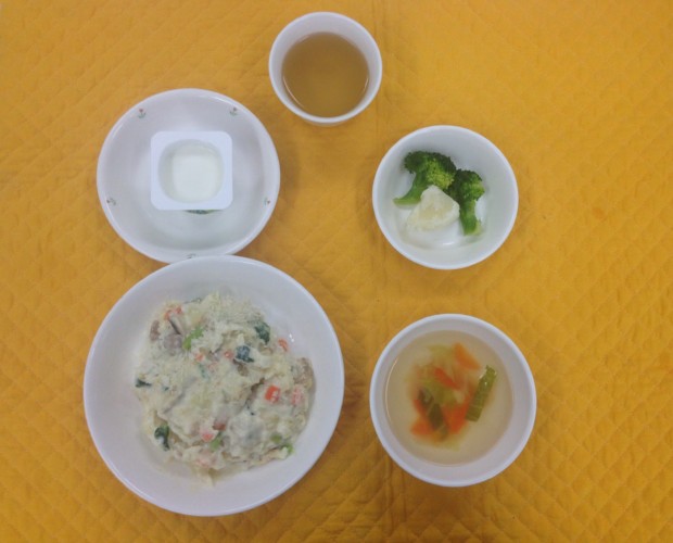 今日の給食の主食『ドリア』には、鶏肉・玉葱・人参・マッシュルーム・小松菜・チーズが入っています。主菜『温野菜』は、じゃが芋・ブロッコリーです。汁物『洋風スープ』には、キャベツ・人参が入っています。 |