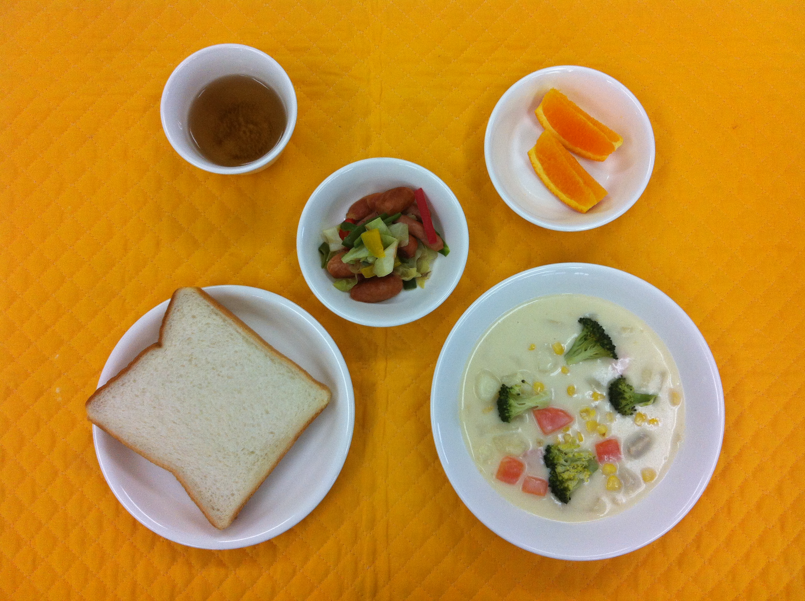 今日の給食は、クリームシチューです。バター、小麦粉、牛乳でホワイトソースを作り、よく炒めた玉ねぎと、じゃがいも、人参、ブロッコリー、鶏肉とホワイトソースを合わせコンソメで味付けし仕上げました。寒い日の体あたたまる一品です。 |
