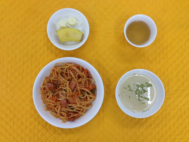 今日は、玉ねぎ・人参・ピーマン・ウインナーを炒め、ケチャップ・コンソメで味を調えてナポリタンスパゲティを作りました。スープは、玉ねぎの甘みをしっかりだし、ベーコン・コーンクリームを入れて仕上げました。フルーツは、バナナを添えました。