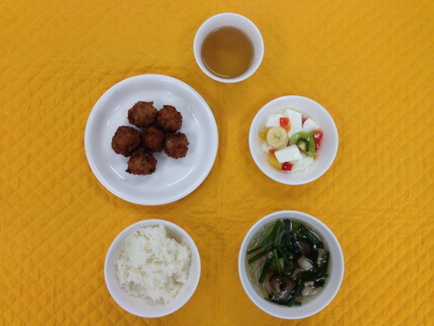 今日の主菜は、玉ねぎ・人参・ネギを豚ミンチとよく合わせ下味をつけた後、油で揚げ肉団子を作り甘酢で和えました。スープには、春雨・しめじ・ニラを入れ中華味で仕上げました。手作り杏仁豆腐の中には、バナナ・キウイ・パイナップル・みかん・桃をシロップの中に入れ作りました。