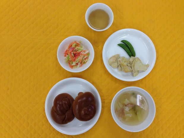 今日は、ヨーグルトとカレー粉でつけ込んだタンドリーチキンと黒糖パンです。鶏胸肉を使いました。ヨーグルトにつけ込むことによってとても柔らかく仕上がりました。 |