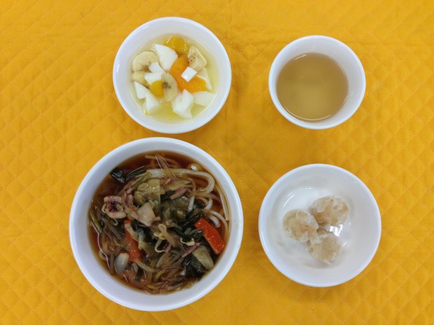 今日はあんかけうどんです。イカ・きゃべつ・玉ねぎ・ほうれん草・ニラが入ったあんかけです。デザートは子ども達に人気の杏仁豆腐をつけました。 |