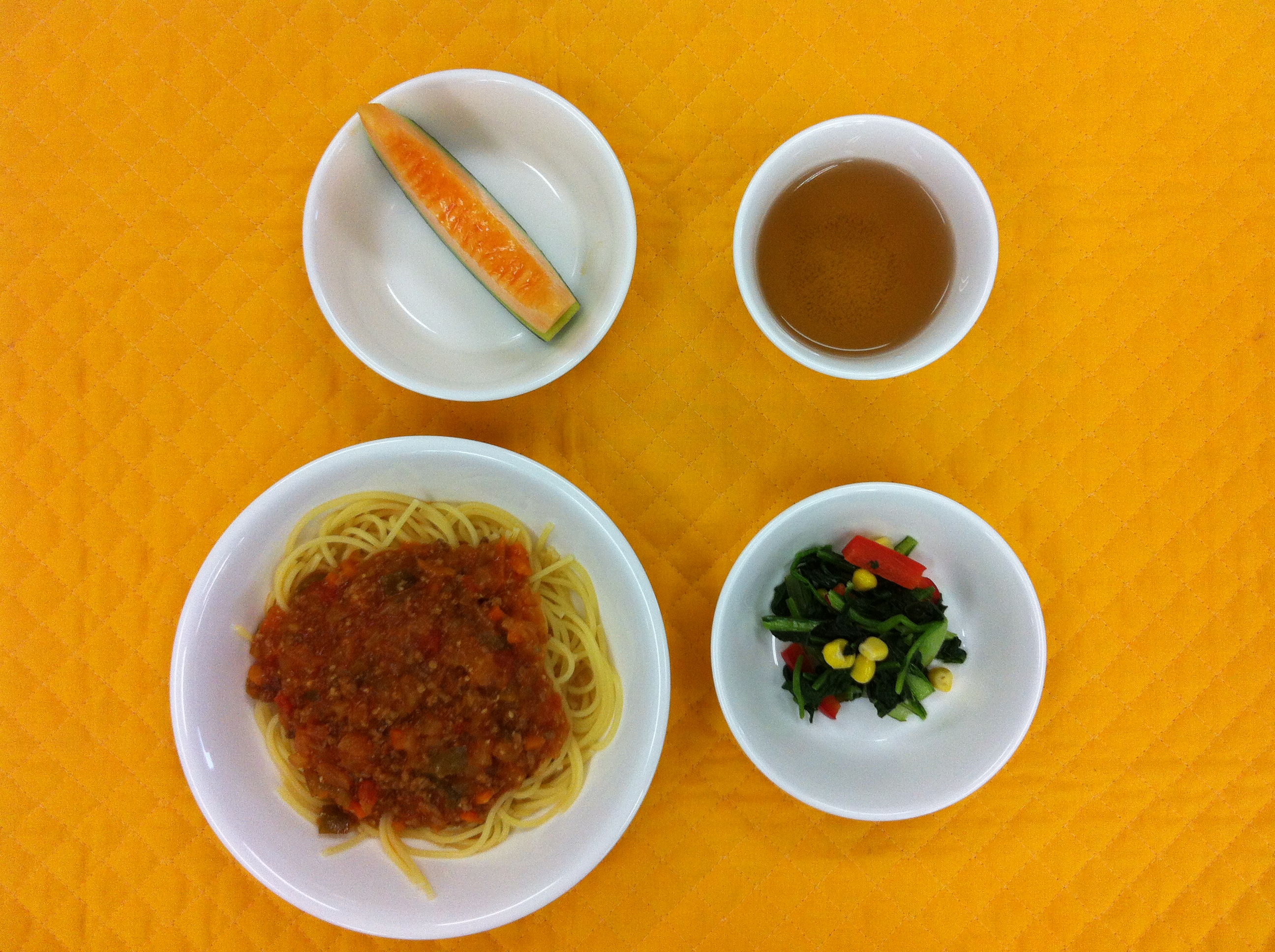 今日の給食は、ミートソーススパゲティーです。ひき肉、人参、ピーマン、園で採れた玉ねぎを沢山に使いました。玉ねぎの甘味が出て、子どもたちが好きなソースになりました。コクを出すため、最後に粉チーズをふんだんに使いました。旬のメロンは初登場です。 |