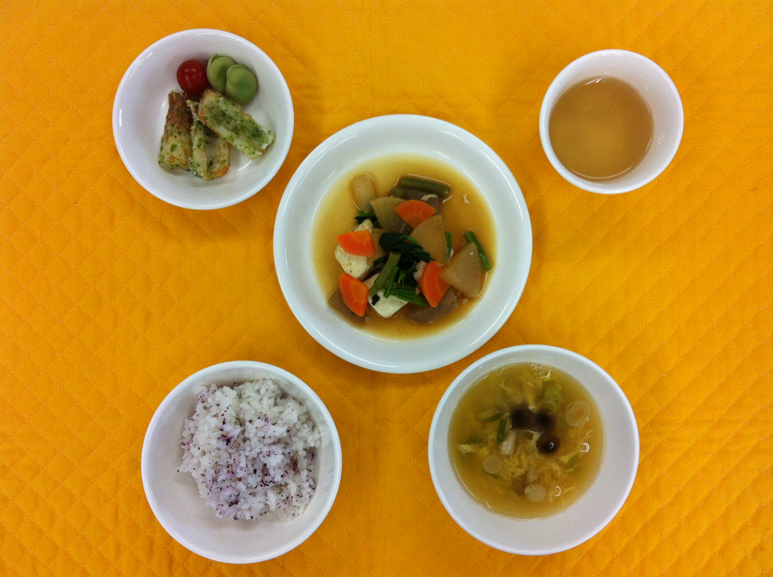 今日の給食は、豆腐と野菜の煮物です。豆腐は煮ると崩れやすいので、煮る前に茹で、形が崩れないように気をつけました。味付けは、味噌、醤油でシンプルにしました。園で採れた新玉ねぎも煮物に入れました。