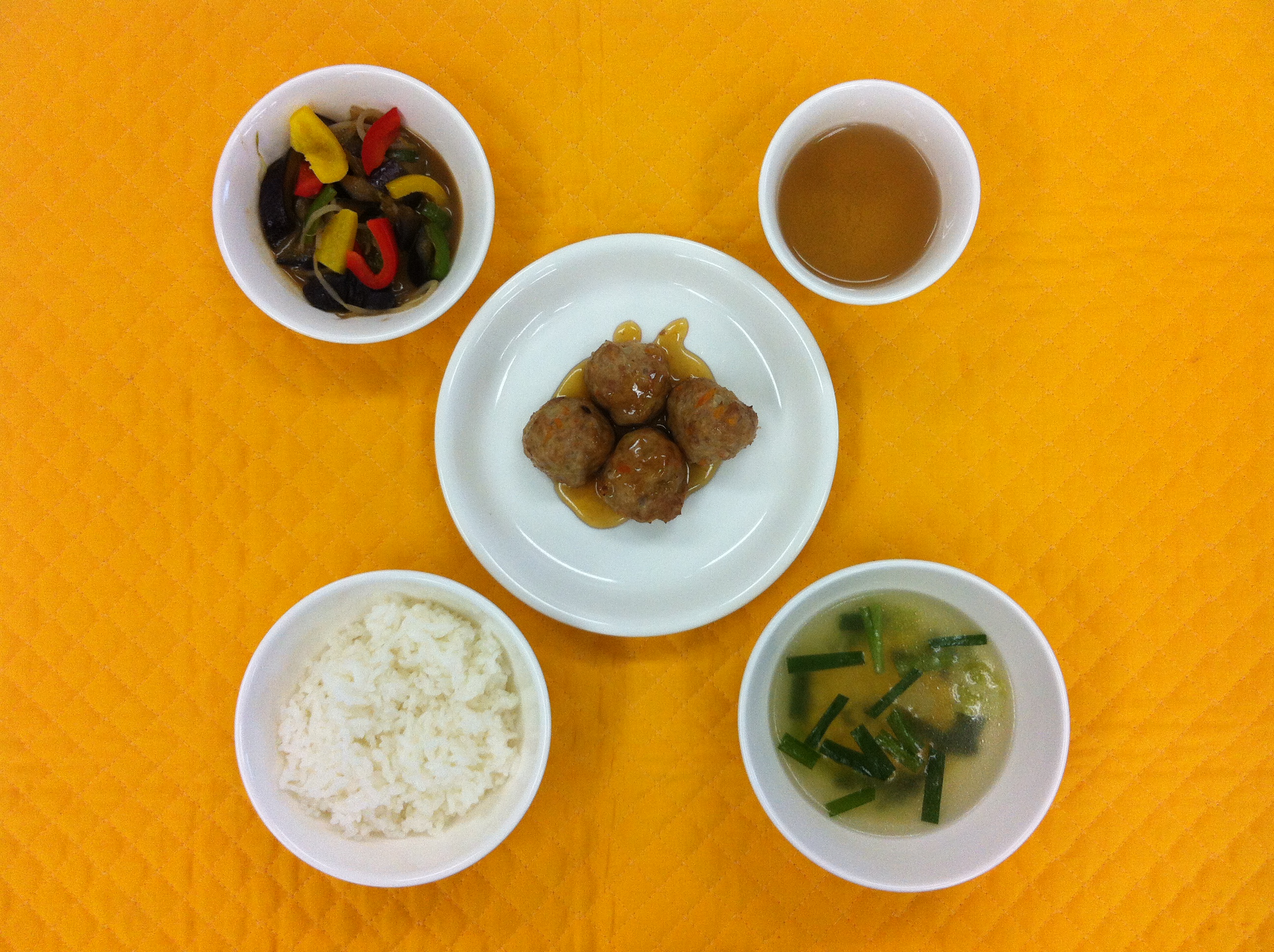 今日の給食は、肉団子の甘酢かけです。団子の玉ねぎ、人参は蒸し焼きにして、お肉に混ぜ練りました。蒸すことで、野菜の甘味が出て、お肉もやわらかくなります。甘酢は酢を控えめに、子どもたちが食べやすい餡にしました。ナスの味噌炒めは、ピーマン、パプリカを使い彩りよく出来ました。