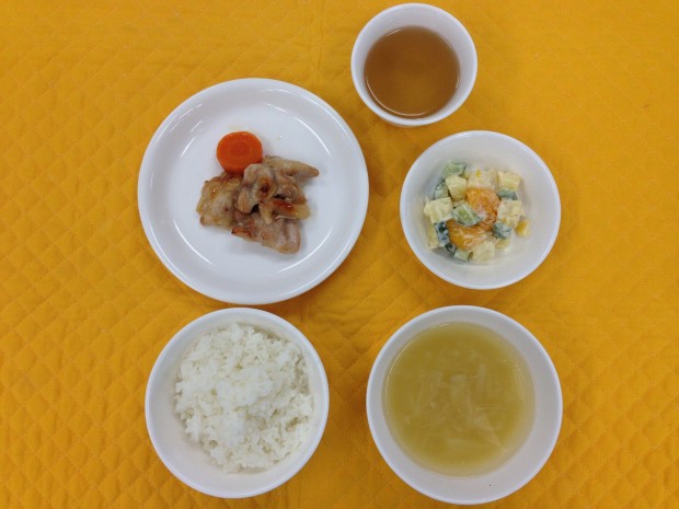 今日の給食は、鶏肉のマーマレード焼きです。サラダは、じゃがいも・きゅうり・フルーツが入り、マヨネーズ・ヨーグルト・塩・こしょうで味付けしたさっぱりサラダです。