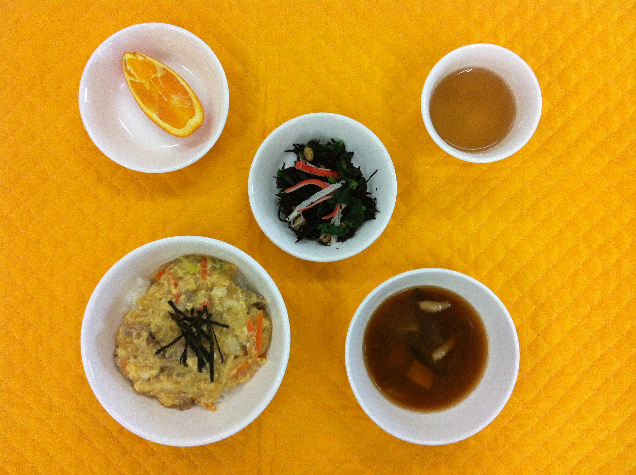 今日の給食は、親子丼です。親子丼の具には、朝園児が取ってくれた新玉ねぎを使いました。生で試食しましたが、甘くてとてもみずみずしいです。子どもたちが食べやすいよう、餡にとろみをつけました。ひじきの和え物は、ひじき、大豆を薄味で煮て、ボイルした小松菜と和えました。 |