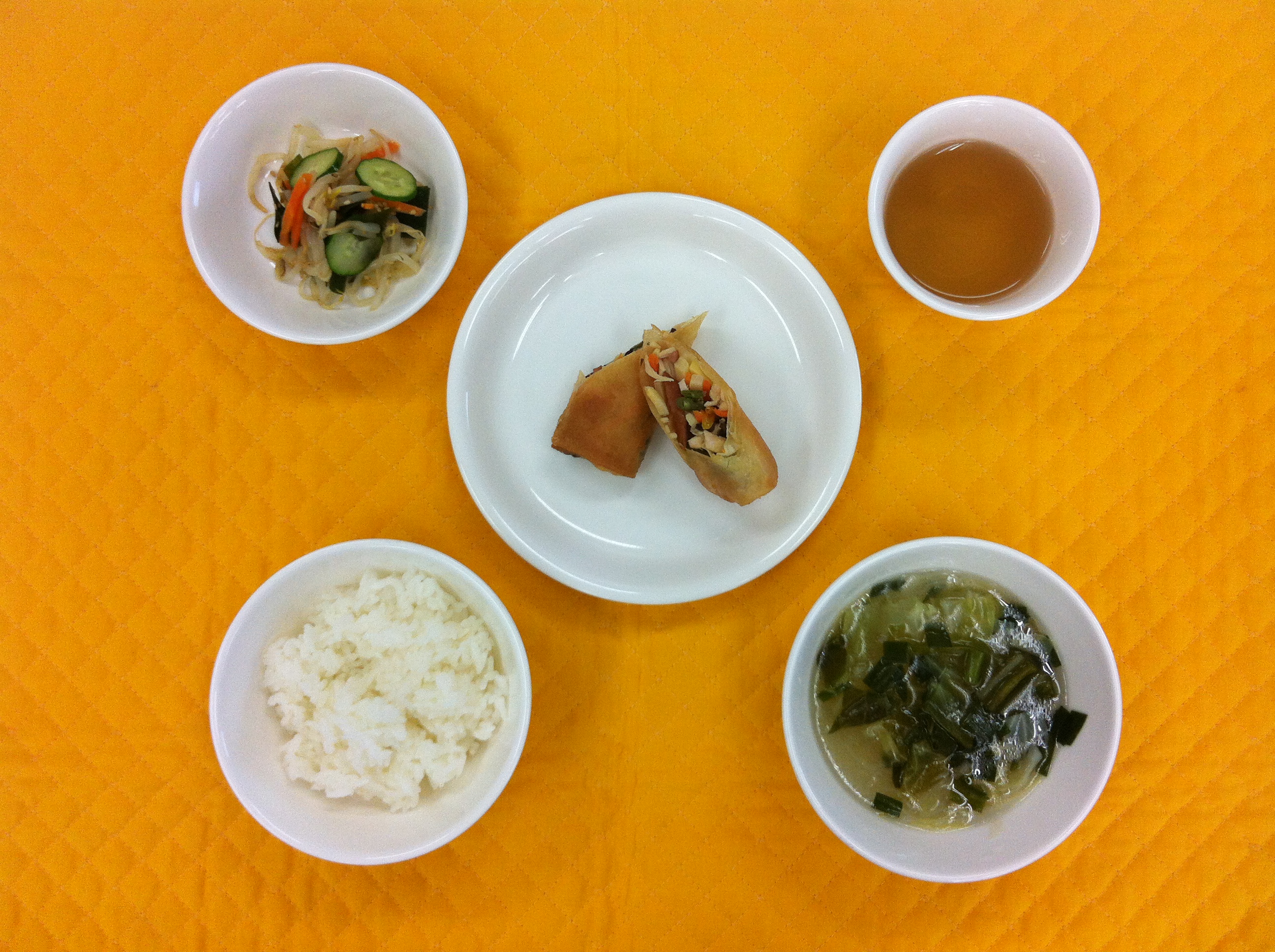 今日の給食は、ささみの春巻きです。春巻きの具には、ささみ、タケノコ、きくらげ、インゲン、人参が入っています。中華だしと醤油で味付けして、サクット揚げました。和え物には、生のわかめをボイルして使いました。シャキシャキと食べごたえがあります。