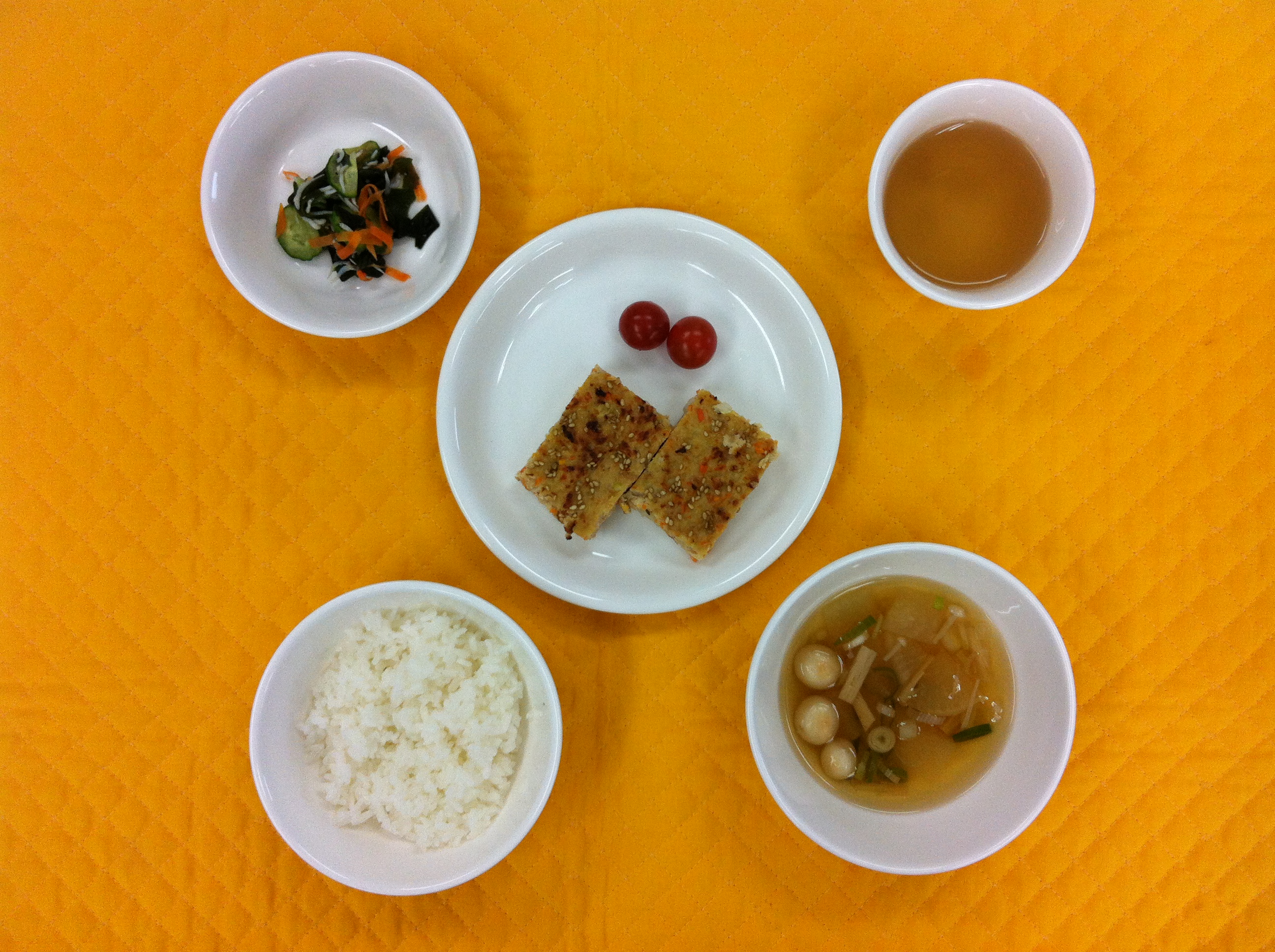 今日の給食は、松風焼きです。みじん切りにした、玉ねぎ、人参をミンチ、卵、調味料、片栗粉で混ぜ、胡麻を振って焼きました。野菜を多く入れたので、柔らかく出来ました。給食で初登場メニューです。 |