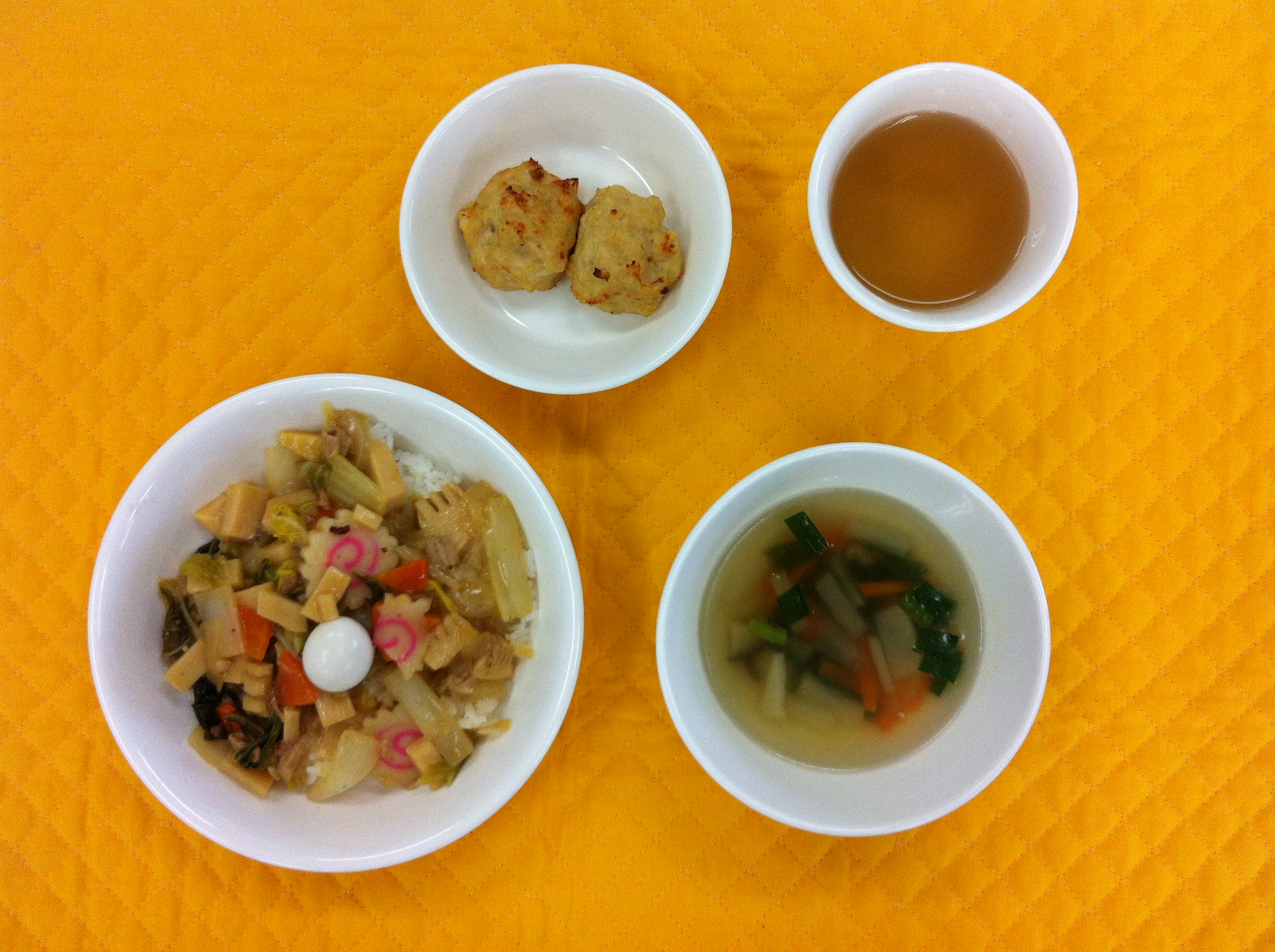 今日の給食は、中華どんぶりです。中華味をきかせ沢山の具を、固めの片栗粉でとじました。つくねは、新玉ねぎをみじん切りにし蒸し焼きにする事で甘みを出しました。味付けは、シンプルに、醤油、塩、しょうがのみです。ふんわりと仕上がりました。 |