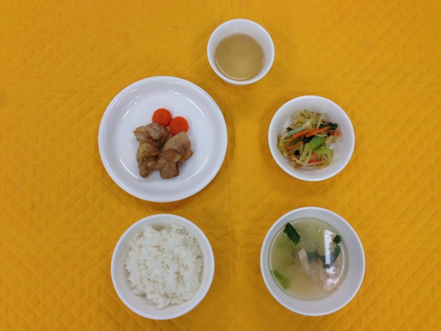 今日はみんなの大好きなから揚げです。今日は鶏もも肉を使い、にんにくを少しきかせました。また中華風和え物は、もやし・人参・こまつな・キャベツを入れて作りました。