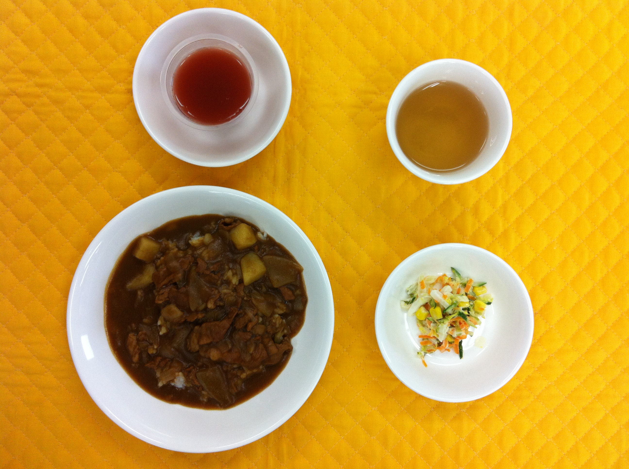 今日の給食は、ハヤシライスです。よく炒めた玉ねぎ、じゃが芋、マッシュルーム、お肉を煮込み、ルーで味付けしました。子どもたちに食べやすいよう、薄味に仕上げました。ゼリーは、野菜ジュースを使ってゼリーを作りました。