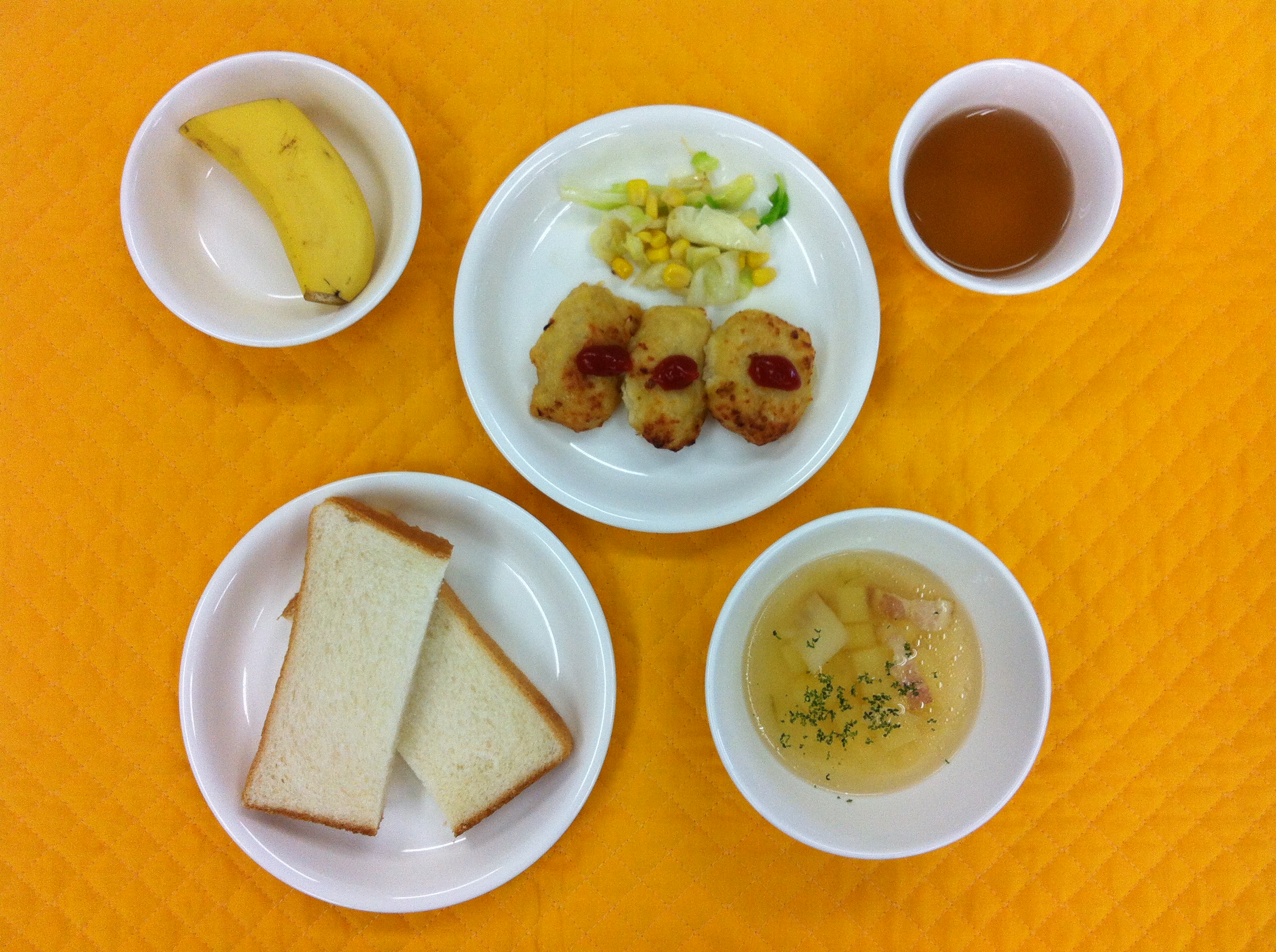 今日の給食は、チキンナゲットです。鶏ミンチ、豆腐、調味料を入れ、オーブンで揚げ焼きにしました。高温で焼くことで、揚げたようなサクサクになります。豆腐が沢山入って入るので、ヘルシーでふんわりと仕上がりました。 |