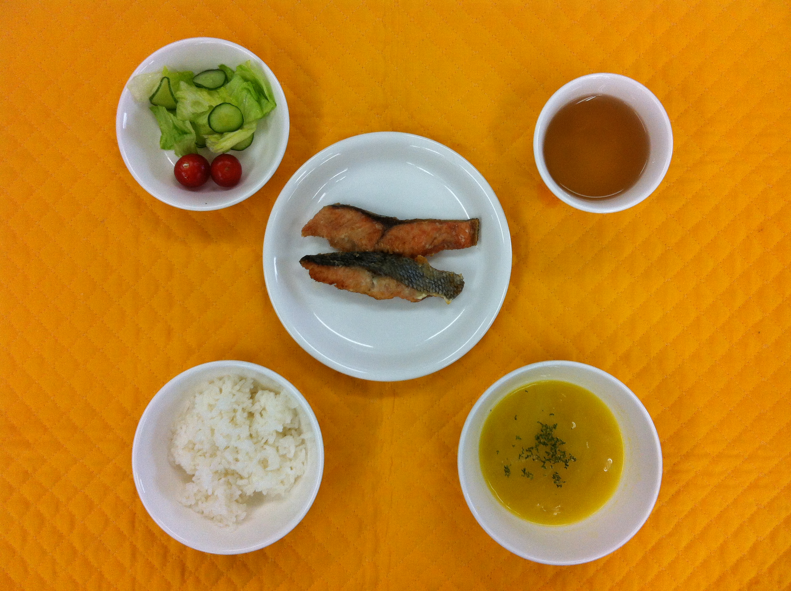 今日の給食は、鮭のムニエルです。塩コショウをし、小麦粉をつけ、オーブンでかりっと焼きました。パンプキンスープは、パンプキンペーストを使ってスープを作りました。かぼちゃの甘さがでたスープになりました。 |