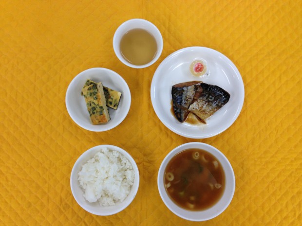 今日の給食は生姜をきかせた味噌で煮たさばの味噌煮です。副菜は、ひじき・ピーマンが入っただし巻き卵です。味噌汁には、納豆・豆腐・ねぎが入りました。デザートにプチゼリーが付きました。 |