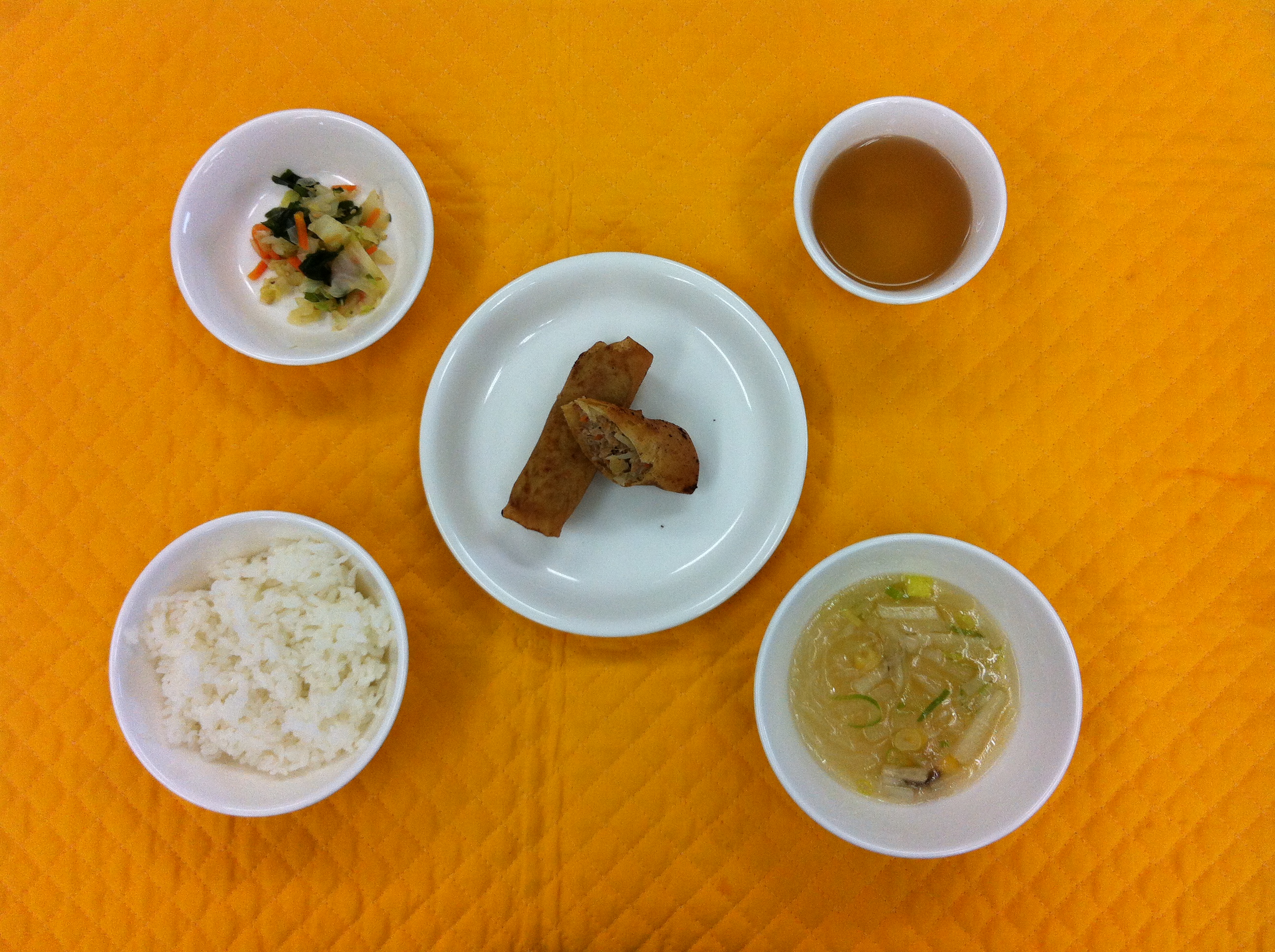 今日の給食は、ひき肉の春巻きです。ひき肉、荒くみじん切りにした、もやし、人参が入っています。味付けは、醤油、酒、ごま油と、風味を出すため少しカレー粉を入れてみました。配膳するぎりぎりで揚げたのでカリィッと揚げたてを提供することができました。 |