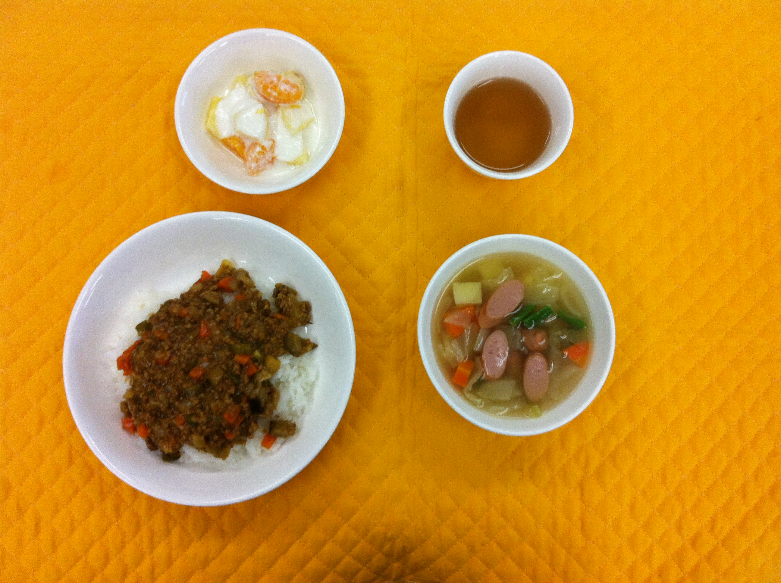 今日の給食は夏野菜のドライカレーです。幼稚園の畑で収穫したトマト・ピーマン・オクラ・なすがドライカレーにたっぷり入ってます。ポトフにはソーセージの他に、にんじんやじゃが芋、キャベツ、いんげんなど、ドライカレー同様に野菜をたくさん入れています。
