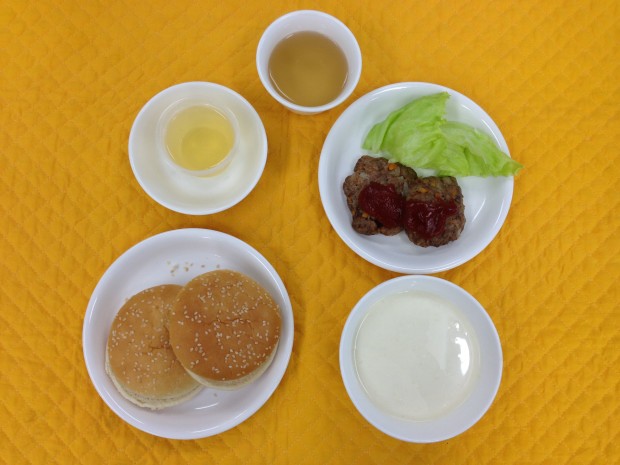 今日の給食は、パンにレタスとハンバーグを挟んでハンバーガーとして食べました。スープは冷たく冷やしたビシソワーズです。デザートにリンゴのゼリーが付きました。 |