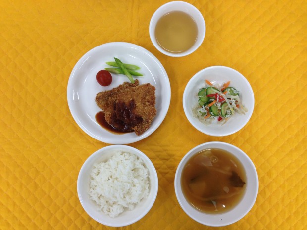 今日は子ども達に人気の豚かつをみそをかけて食べました。サラダには、小女子・きゅうり・人参・もやし・おくらとカルシウムたっぷりのサラダです。 |