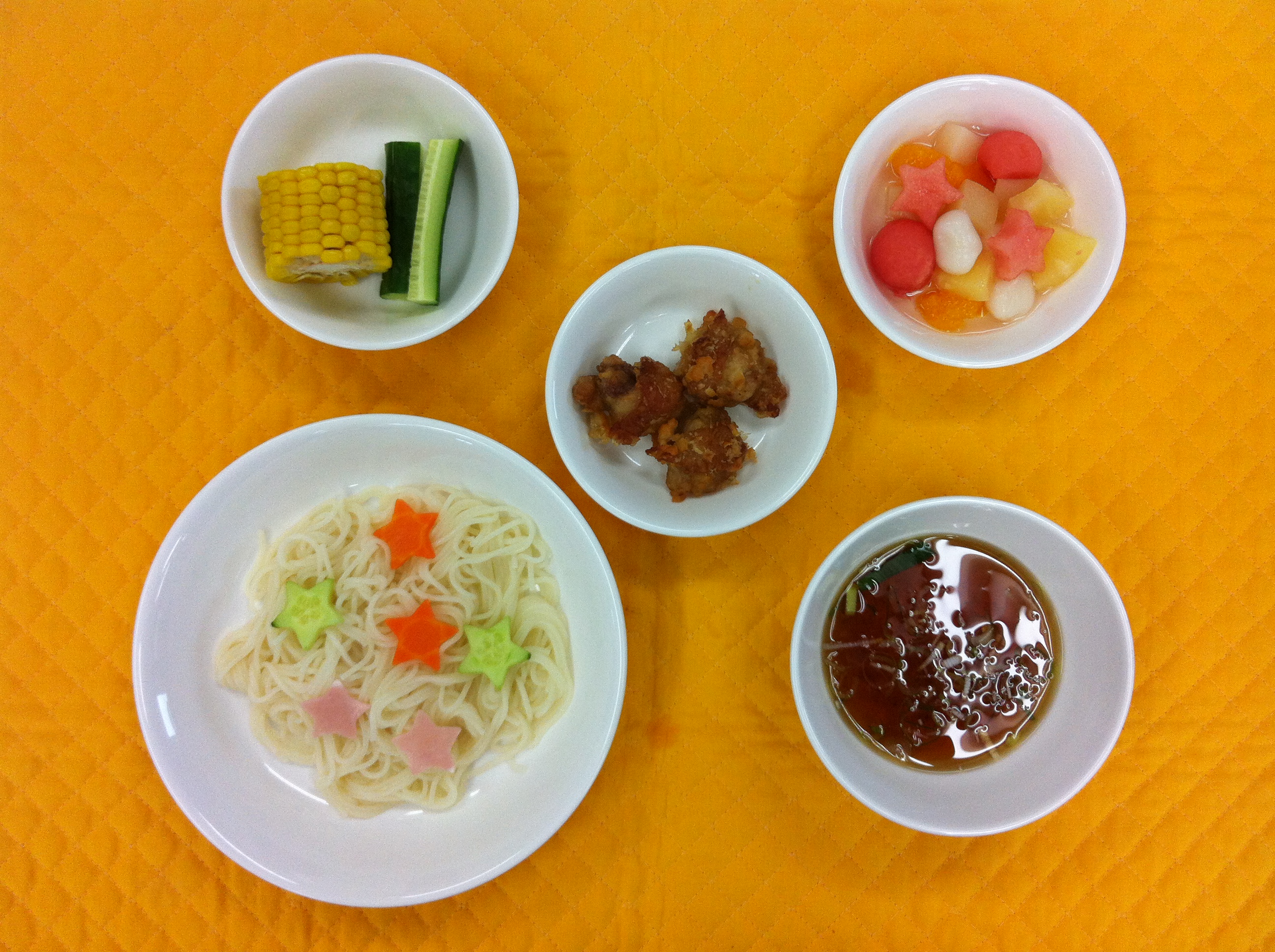 今日の給食はひやむぎです。にんじんやキュウリなど星型にしました。フルーツポンチにはスイカや白玉が入っています。夏らしく、食欲の出る献立となっています。 |