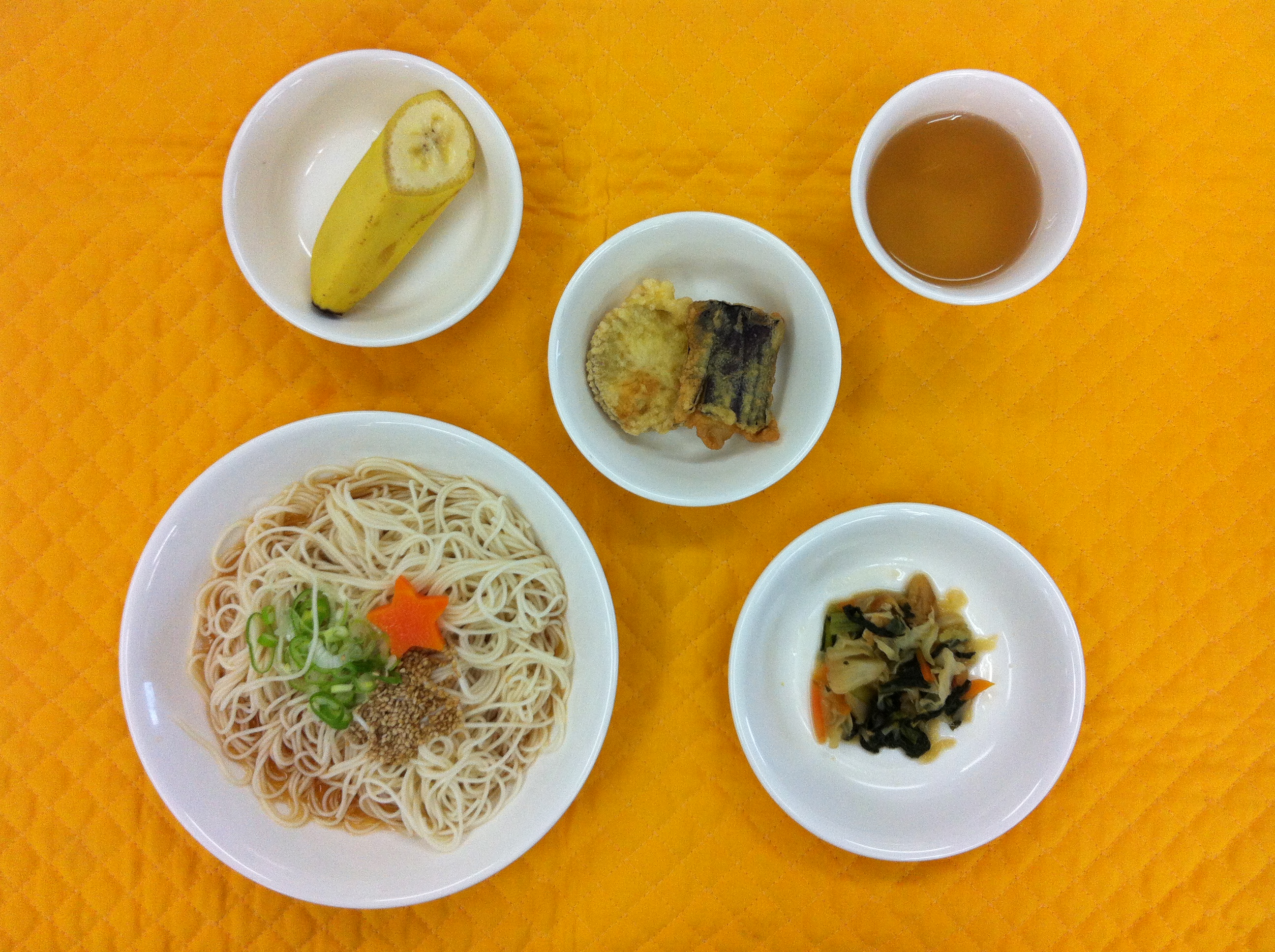 今日の給食は、そうめんです。かつおぶしをたっぷり使い、出し汁を作りました。人参、ネギ、胡麻をトッピングしています。天ぷらは、さつま芋、ナスを揚げました。小麦粉、卵、隠し味に塩を入れ、サックッと揚がるように衣をつけました。