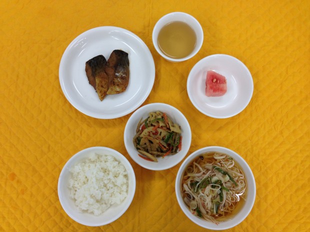 今日は和食メニューです。れんこんのきんぴらには、れんこん・人参・ごぼう・ピーマンが入り、食物繊維たっぷりです。園でとれたスイカが付きました。 |