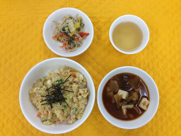 今日の給食は親子丼です。子ども達に人気でよく食べれていました。ごま和えには、ほうれん草・もやし・人参・白菜・ちくわ・小女子・ごまが入りました。