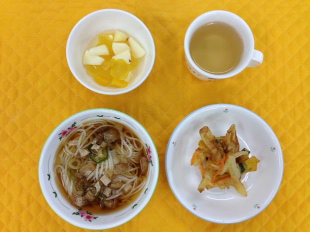 今日の給食はそうめんです。暑い日なので食べやすく子ども達はよく食べていました。野菜のかき揚げには、かぼちゃ・玉ねぎ・人参・ピーマン・ちくわが入りしました。 |